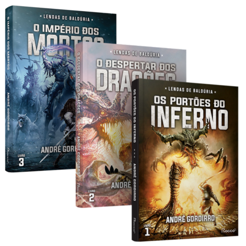 Conjunto contendo três livros da saga fantástica Lendas de Baldúria de André Gordirro. Acompanha pôster. Os portões do inferno Há trinta anos, os aventureiros Krispinus e Danyanna lacravam os Portões do Inferno definitivamente, detendo com uma magia fortíssima a invasão de milhares de demônios, impedindo que o horror e a eterna escuridão dominassem o mundo de Zândia. Para eles foram oferecidos os títulos de Grande Rei e Rainha do agora chamado reino de Krispínia. Zândia finalmente estava livre do maior perigo de sua história. Agora, porém, uma ação completamente ousada traz um risco iminente: svaltares – os elfos das profundezas – marcham em direção aos Portões do Inferno, com a finalidade de reabri-los e trazer novamente o caos para a Te rra. Traído por aliados em que confiava, Krispinus não possui forças para impedir que este sombrio exército se aproxime. O Grande Rei precisa proteger os Portões a qualquer custo, antes que os svaltares rompam suas defesas, mas isso não significa que Krispinus conseguirá, praticamente sozinho, derrotar centenas de svaltares sedentos por vingança – e uma invasão demoníaca, caso o inimigo tenha êxito. Abandonado à própria sorte, Krispinus espera que a ajuda esteja a caminho... mas ela pode vir de onde menos se espera. O despertar dos dragões As lendas de Baldúria continuam com a maior ameaça já enfrentada pelo sexteto de anti-heróis que fechou os Portões do Inferno. Em seu caminho, a fúria dos dragões de Zândia. Não há descanso para Baldur, Od-lanor, Derek, Kyle, Kalannar e Agnor, muito menos para o Grande Reino de Krispínia. Na sequência do eletrizante embate que culminou no fechamento dos Portões do Inferno, o inusitado grupo de salvadores da pátria parte a bordo do Palácio dos Vento s para resolver uma nova missão a mando da Coroa, sem saber que o reino corre perigo outra vez. Enquanto isso, convicto de que a guerra contra os humanos está próxima do fim e certo de sua derrota, o rei elfo Arel tem planos malignos de soprar a Tro mpa dos Dragões e, assim, destruir o mundo por completo. Ele está determinado e disposto a exterminar quem quer que cruze seu caminho e se oponha ao seu objetivo. Será que essa nova ameaça do passado pode ser contida pelos anti-heróis dos Portões do Inferno? O império dos mortos Terceiro e último livro da saga fantástica Lendas de Baldúria. Apesar de terem fechado os Portões do Inferno de uma vez por todas e impedido o Despertar dos Dragões, os anti-heróis das Lendas de Baldúria não conseguem