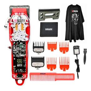1x Máquina de cortar cabelo 409 4x Pentes guia 3/6/9/12mm Vermelho 2x Pentes guia premiun 1,5 4,5 Preto 1x Óleo lubrificante 1x Escova de limpeza, 1x Pente de cabelo Vermelho 1x Carregador 1x Lâmina de Cerâmica Preto 1x Grip de Borracha 1x Capa Estampa Grande Wmark Exclusivo