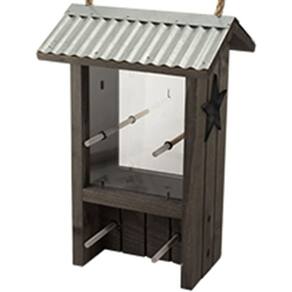 Comedero rústico estilo rancho para pájaros, con techo de metal galvanizado y decoración lateral en forma de estrella metálica. Puede sostener hasta 1,25 libras de semillas, soportando múltiples aves a la vez. Mide 15,24 cm de largo, 18,42 cm de ancho y 27,94 cm de alto, ideal para tu jardín. Se cuelga fácilmente con la cuerda de yute incluida, perfecta para que los pinzones se posen y se alimenten en ambos lados. Versátil para colocar en tu patio trasero: puede ser montado o colgado según lo necesites.