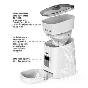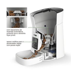 Painel inteligente LCD para programar as alimentações com instruções detalhadas Capacidade de armazenamento de 4L Sensor embutido que notifica em caso de necessidade de reabastecimento de ração Alto-falante e gravador com capacidade de 10 segundos de mensagem de voz Programação de até 6 refeições diárias com ajustes de até 50 porções com 5g cada Mecanismo de reversão automática que evita problemas de alimentos presos Usar rações entre 5mm e 15mm Indicado para cães e gatos de todos os portes Produto bivolt Conta com o uso de 3 pilhas D em caso de queda de energia pilhas não inclusas .