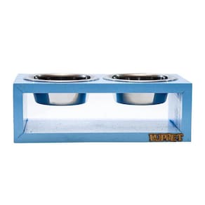 Comedouro Duplo Para Cães e Gatos Madeira Com Potes Inox Luppet Azul - Indicado para cães e gatos; - Madeira pinus reaproveitado; - Design lindo e elegante; - 2 tigelas de aço inoxidável; - Não prejudica a coluna do animal. O Comedouro Duplo Para Cães e Gatos Madeira Com Potes Inox Luppet é perfeito para seu cãozinho ou seu gatinho, é feito de madeira de pinus reaproveitado que dá todo um charme e elegância para o comedouro. Acompanha 2 tigelas de aço inoxidável que ficam suspensas do chão, então mantem o espaço limpo e também não deixa que o animal retire ou arraste o pote do lugar. A madeira acrescenta um toque moderno à decoração do lar, e as tigelas de aço inoxidável são resistentes a bactérias e laváveis em lava-louças, além disso, o comedouro possui pintura hidro-repelente e com verniz para proteger da água e os efeitos dos líquidos que podem eventualmente ser derramados sobre ele. Medidas aproximadas 30x15x10cm Peso aproximado: 600gr Volume de cada tigela: 400ml Cuidados Evite deixar exposto ao sol ou chuva. Isso pode causar problemas de desbotamento da imagem e pintura. A cor pode sofrer pequenas alterações por se tratar de um produto com madeira reaproveitada, mas não interfere na qualidade e no acabamento final. Não utilizar produtos que desgastam e que interfiram na retirada do verniz ou na cor da madeira. Limpar com pano úmido.