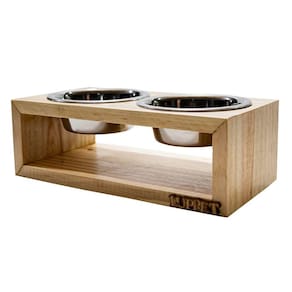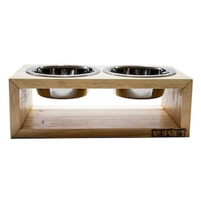 Comedouro Duplo Para Cães e Gatos Madeira Com Potes Inox Luppet Natural - Indicado para cães e gatos; - Madeira pinus reaproveitado; - Design lindo e elegante; - 2 tigelas de aço inoxidável; - Não prejudica a coluna do animal. O Comedouro Duplo Para Cães e Gatos Madeira Com Potes Inox Luppet é perfeito para seu cãozinho ou seu gatinho, é feito de madeira de pinus reaproveitado que dá todo um charme e elegância para o comedouro. Acompanha 2 tigelas de aço inoxidável que ficam suspensas do chão, então mantem o espaço limpo e também não deixa que o animal retire ou arraste o pote do lugar. A madeira acrescenta um toque moderno à decoração do lar, e as tigelas de aço inoxidável são resistentes a bactérias e laváveis em lava-louças, além disso, o comedouro possui pintura hidro-repelente e com verniz para proteger da água e os efeitos dos líquidos que podem eventualmente ser derramados sobre ele. Medidas aproximadas 30x15x10cm Peso aproximado: 600gr Volume de cada tigela: 400ml Cuidados Evite deixar exposto ao sol ou chuva. Isso pode causar problemas de desbotamento da imagem e pintura. A cor pode sofrer pequenas alterações por se tratar de um produto com madeira reaproveitada, mas não interfere na qualidade e no acabamento final. Não utilizar produtos que desgastam e que interfiram na retirada do verniz ou na cor da madeira. Limpar com pano úmido.