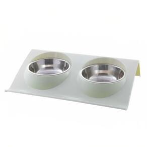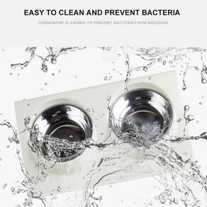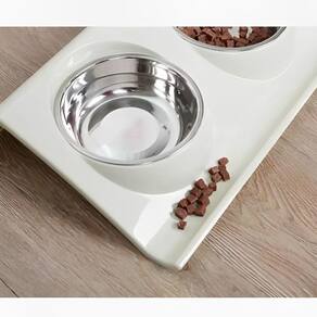 O comedouro elevado duplo possui recipientes em inox para ração e água e bandeja em polipropileno com formato ergonômico que auxilia para que a ração não esparrame.