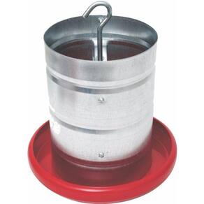 Conhecido como comedouro suspenso, utilizado por sitiantes em aviários, tubo galvanizado, base(prato) plástico vermelho.