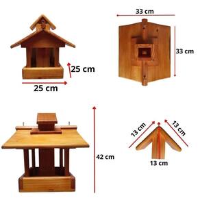 Peso: 3,400Kg Tamanho do Tratador: 25cmx25x5cm Tamanho do telhado: 33cmx33cmx2cm Altura total: 42cm Cor: Vernizado na cor Imbuia