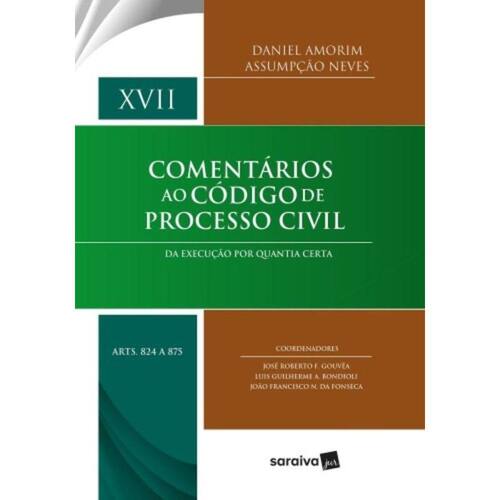 Comentários ao Código de Processo Civil constitui-se em uma coleção de 21 volumes que reúnem a análise dos 1.072 artigos do CPC de 2015. Cada volume é escrito por juristas de renome, consagrados por suas atuações profissionais e pela qualidade de suas contribuições acadêmicas. As obras destacam-se pela densidade nos estudos, unindo a teoria doutrinária e a prática processual na solução dos problemas a serem enfrentados pelos acadêmicos e profissionais do direito. No volume XVII, o autor Daniel Amorim Assumpção Neves analisa os arts. 824 a 875 do CPC, tratando da execução por quantia certa.