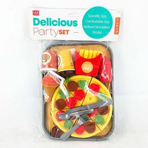 Kit para a criançada se divertir com as comidinhas com o kit de festa. Comidas realistas com ótima qualidade que irão impressionar toda a criançada. Contém no kit 6 peças de comida e mais os talheres, um pratinho e uma bandeja. Contém também uma pizza que pode ser divididas em 6 fatias.
