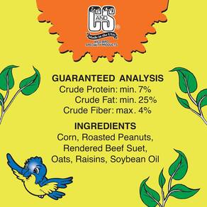 - Contém sebo de carne renderizada, amendoim torrado, passas, milho e aveia