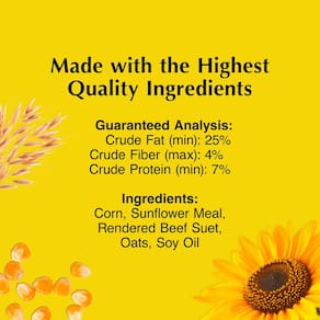 - Uma solução de alimentação versátil. As pepitas de sebo de girassol C&S podem ser alimentadas sozinhas ou misturadas com 2,3 a 4,5 kg. de mistura de sementes de pássaros selvagens.