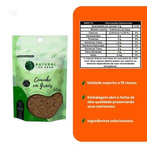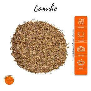 Cominho - Embalagem: 50g - Ingredientes: Cominho em grão. - Informações: O Cominho é a semente de uma planta medicinal também chamada de alcaravia, muito utilizada como condimento em culinária ou como remédio caseiro para flatulência e problemas digestivos. O seu nome científico é Cuminum cyminum e tem aroma forte e sabor marcante. - Como consumir: O cominho pode ser como tempero de sopas, caldos, carnes e pratos com frango. - Modo de armazenamento: Armazene em um local fresco, seco e arejado, abrigado de fontes de calor e luz direta. Após abertos, devem ser consumidos até a data de validade indicada na embalagem. - Alérgenos: Pode conter soja e oleaginosas. Não contém glúten. Marca: Não Informado Ean: 7908688856182