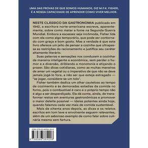 Uma das provas de que somos humanos, diz M.F.K. Fisher, é a nossa capacidade de aprender como viver melhor. Neste clássico da gastronomia publicado em 1942, a escritora norte-americana oferece um jeito de pensar a cozinha que ultrapassa as restrições impostas pelo racionamento dos anos da Segunda Guerra Mundial e justifica seu caráter altamente literário. Suas palavras e sensações nos conduzem a cozinhar de maneira inteligente e econômica, sem perder o humor e a diversão, driblando a monotonia e atiçando o prazer. Ela dá conta, ainda, de transformar restos em aventuras gastronômicas e promover o maior deleite possível — ideias potentes ainda hoje, quando falamos cada vez mais de comida sustentável. Mais de oitenta anos depois, as dicas e os relatos escritos em tom leve e envolvente seguem relevantes, além de um saboroso exemplo de como falar sobre culinária mesmo sem fartura.