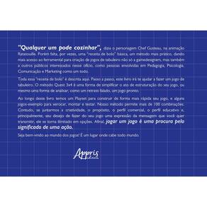 "Qualquer um pode cozinhar", dizia o personagem Chef Gusteau, na animação Ratatouille. Porém falta, por vezes, uma “receita de bolo” básica, um método mais prático, dando mais acesso ao ferramental para criação de jogos de tabuleiro não só a gamedesigners, mas também a outros públicos interessados nesse ofício, como pessoas envolvidas em Pedagogia, Psicologia, Comunicação e Marketing como um todo. Toda essa "receita de bolo" é descrita aqui. Passo a passo, este livro irá te ajudar a fazer um jogo de tabuleiro. O método Quest 3x4 é uma forma de simplificar o ato de estruturação do seu jogo, ou mesmo uma forma de analisar, como um retrato falado, um jogo pronto. Ao longo deste livro temos um Playset para construir de forma mais rápida seu jogo, e alguns jogos-exemplo para xerocar, montar e testar. Nosso método permite mais de 100 combinações. Contudo, se juntarmos a criatividade, o propósito, o perfil comercial, o perfil educativo e, principalmente, seu desejo de fazer do seu jogo uma expressão da mensagem que você quer transmitir, ele se torna ilimitado em opções. Afinal, jogar um jogo é uma procura pelo significado de uma ação. Seja bem-vindo ao mundo dos jogos! É um lugar onde cabe todo mundo.