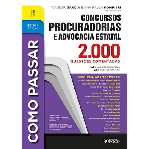 SOBRE A IMPORTÂNCIA DA COLEÇÃO COMO PASSAR A Coleção COMO PASSAR! é, hoje, líder no segmento de preparação para concursos públicos por meio da resolução de questões de provas anteriores. Dezenas de milhares de examinandos que estudaram pelas obras obtiveram aprovação e atingiram seus objetivos. Esses resultados decorrem do esforço e da experiência dos coordenadores e dos demais autores, bem como das características especiais de nossas obras, que são as únicas no mercado que trazem tamanho número de disciplinas, além da classificação dos temas e subtemas ao máximo, possibilitando que o examinando estude cada assunto dos editais dos concursos de modo organizado e planejado. Tudo sem contar o enorme custo-benefício de juntar tanto conteúdo num volume apenas, reduzindo custos e gasto de papel, de modo a gerar para o consumidor economia, respeito ao meio ambiente e praticidade. É por isso que os estudantes vêm chamando nosso livro de O Melhor Amigo do Concurseiro , num reconhecimento claro da indispensabilidade da obra para quem deseja ser aprovado em concursos jurídicos. SOBRE COMO PASSAR EM CONCURSOS DE PROCURADORIAS E ADVOCACIA ESTATAL A experiência diz que aquele que quer ser aprovado deve fazer três coisas: a) entender a teoria; b) ler a letra da lei; e c) treinar. A teoria é vista em cursos e livros à disposição no mercado. O problema é que ela, sozinha, não é suficiente. É fundamental ler a letra da lei e treinar . E a presente obra possibilita que você faça esses dois tipos de estudo. Aliás, você sabia que mais de 90% das questões de Concursos de PROCURADORIAS E ADVOCACIA ESTATAL são resolvidas apenas com o conhecimento da lei, e que as questões das provas se repetem muito? Cada questão deste livro vem comentada com o dispositivo legal em que você encontrará a resposta. E isso é feito não só em relação à alternativa correta. Todas as alternativas são comentadas. Com isso você terá acesso aos principais dispositivos legais que aparecem nas provas e também às orientações doutrinárias e jurisprudenciais. Estudando pelo livro, você começará a perceber as técnicas dos examinadores e as pegadinhas típicas de prova, e ganhará bastante segurança para o momento decisivo, que é o dia do seu exame. É por isso que podemos afirmar, com uma exclamação, que esta obra vai lhe demonstrar COMO PASSAR em Concursos de Procuradorias e Advocacia Estatal!