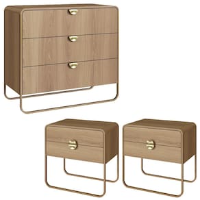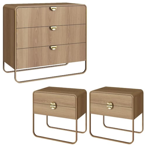 Conjunto de Cômoda e 02 Mesas de cabeceiras que combinam design orgânico e contemporâneo com a praticidade para o dia a dia. Estrutura em MDP 15mm (cantoneiras em MDF) e acabamento em pintura BP. Conta com 7 gavetas totais com corrediças telescópicas, puxadores em poliestireno (estilo meia lua), pés em metal, além de sapatas plásticas que protegem o piso contra riscos. Produto será entregue em 03 volumes.