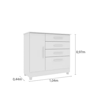Com a Cômoda Chicago seu quarto estará completo e seus pertences bem organizados. Produzida inteiramente em MDP, possui 4 gavetas com corrediças metálicas e uma porta, tampo de 25mm e espaço sapateira. Acabamento resistente com impressão UV e verniz de alta duração. Acabamento da Gaveta: Pintura Acabamento da Porta: Pintura Acabamento da Prateleira: Pintura Acabamento dos Pés: Pintura Altura dos Pés: 6 Ambiente Principal: Quarto Complexidade da Montagem: Baixa: pode ser montado por uma pessoa sozinha Cor: Neve Cor do Produto: Neve Escala de Brilho: Fosco Escala de Brilho da Gaveta: Fosco Escala de Brilho da Porta: Fosco Escala de Brilho da Prateleira: Semi-Fosco Gaveta com Chave: Não Itens Inclusos: 1 Cômoda, Kit Ferragens e Manual de Montagem. Linha ou Coleção: Chicago Manual de Montagem e Instalação: https://cdn2.madeiramadeira.com.br/tecnico/tcil-moveis/299179-esquema-de-montagem-c-moda-4-gav-chicago.pdf Material da Gaveta: MDP Material da Porta: MDP Material da Prateleira: MDP Material do Fundo: MDP Material do Puxador da Gaveta: PVC Material do Puxador da Porta: PVC Material dos Pés: MDP Material Principal: MDP Necessita Montagem: Sim Origem do Produto: Nacional Pés Reguláveis: Não Peso: 34.56 Peso Máximo por Gaveta: 10 Peso Máximo por Prateleira: 10 Possui Espelho: Não Possui Nichos: Não Possui Pés: 04 Possui Portas: 01 Possui Prateleiras: 01 Possui Rodízio: Não Recomendações de Uso, Manutenção e Limpeza: Não colocar o produto em lugar úmido, não arrastar, limpar somente com pano macio e seco, não expor o produto a incidência de luz solar, não colocar peso superior ao indicado. Sapatas Niveladoras: Não Sistema de Montagem: Parafusos, Cavilhas e Pregos Suporta Até (kg): 50 Tipo de Corrediça da Gaveta: Metálica Telescópica Tipo de Dobradiça/Corrediça da Porta: Metálica Tipo de Porta: Bater Tipo de Puxador da Gaveta: Externo Tipo de Puxador da Porta: Externo