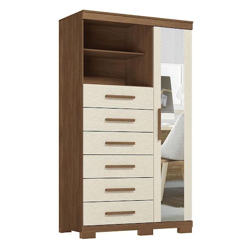 Comoda 1 porta 6 gavetas Marabá com espelho e pés Jatobá Areia Acetinado - Santos Andirá