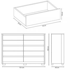 Características: 10 Gavetas Corrediças telescópicas Estrutura em MDP Gavetas suportam 5 kg Possui kit anti-tombamento 6 Pés Tampo e molduras de 25 mm Tampo superior suporta 15 kg