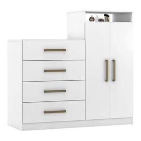 Uma cômoda elegante que complementa o ambiente e oferece muita praticidade. Com quatro gavetas espaçosas e um armário de duas portas com duas prateleiras internas, espaço para acomodação de roupas e objetos não será um problema. Ainda conta com um nicho na parte superior para itens menores ou objetos de decoração. Com puxadores na cor bronze, sua fabricação é feita em MDP de alto padrão, com acabamento resistente, proporcionado por sua pintura UV . Acabamento da Gaveta: Pintura UV Acabamento da Porta: Pintura UV Acabamento da Prateleira: Pintura UV Ambiente Principal: Quarto Complexidade da Montagem: Alta: deve ser montado por um montador especializado Cor: Branco Cor do Produto: Branco Cor Interna: Branco Escala de Brilho: Brilhante Escala de Brilho da Gaveta: Brilhante Escala de Brilho da Porta: Brilhante Escala de Brilho da Prateleira: Brilhante Gaveta com Chave: Não Itens Inclusos: 1 Cômoda, Kit Ferragens e Manual de Montagem Manual de Montagem e Instalação: https://cdn2.madeiramadeira.com.br/atributo/demobile-novo/1195022-4270-comoda-02-portas-04-gav-aurea.pdf Material da Gaveta: MDP Material da Porta: MDP Material da Prateleira: MDP Material do Fundo: HDF Material do Puxador da Gaveta: Plástico Material do Puxador da Porta: Plástico Material Principal: MDP Necessita Montagem: Sim Origem do Produto: Nacional Peso: 42.3 Peso Máximo por Gaveta: 3 kg Peso Máximo por Prateleira: 5 kg Possui Espelho: Não Possui Nichos: Não Possui Pés: Não Possui Portas: 02 Possui Prateleiras: 03 Recomendações de Uso, Manutenção e Limpeza: Utilizar flanela seca Sapatas Niveladoras: Sim Sistema de Montagem: Parafusos e Cavilhas Suporta Até (kg): 7 Tipo de Corrediça da Gaveta: Metálica Simples Tipo de Dobradiça/Corrediça da Porta: Aço Tipo de Porta: Bater Tipo de Puxador da Gaveta: Externo Tipo de Puxador da Porta: Externo