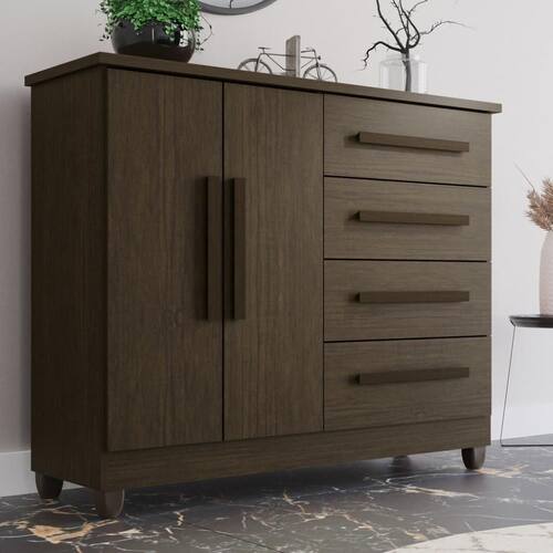 Altura: 107 CM | Largura: 114 CM | Material da Estrutura: MDP | Profundidade: 44 cm | Quantidade de Gavetas: 4 gavetas Cor: Wenguê Naturale
