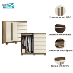 Comoda 2 portas 5 gavetas Malaga Gold com pés Jatobá Areia: A cômoda Málaga Gold da Santos Andirá é um móvel elegante e muito funcional. Ela oferece ótimo espaço pra organizar roupas e ainda conta com um compartimento interno ideal pra pendurar camisas, vestidos e jaquetas. O acabamento moderno e sofisticado valoriza o ambiente, garantindo um visual bonito e um móvel resistente, feito pra durar.