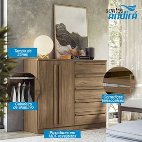 Comoda 2 portas 5 gavetas Malaga Gold Jatobá: A cômoda Málaga Gold da Santos Andirá é um móvel elegante e muito funcional. Ela oferece ótimo espaço pra organizar roupas e ainda conta com um compartimento interno ideal pra pendurar camisas, vestidos e jaquetas. O acabamento moderno e sofisticado valoriza o ambiente, garantindo um visual bonito e um móvel resistente, feito pra durar.