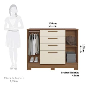 Caracteristicas Estrutura: MDP 12mm e 15mm Acabamento: Pintura UV Quantidade e Tipo de Portas: 2 de bater Tipo de Dobradicas/Trilhos: Dobradicas Metalicas Simples Quantidade de Gavetas: 4 Tipo de Corredicas: Telescopicas Tipo de Puxadores: MDF revestido Quantidade e Tipo de Cabideiros: 1 em Aluminio Quantidade de Prateleiras: 1 Suporte ate: 8kg na prateleira e 3kg por gaveta. Manutencao: Nao limpar com alcool ou qualquer outro produto quimico, utilize somente pano seco ou levemente umedecido. Sistema de Montagem: Cavilhas, Parafusos e Minifix Itens Inclusos: 1 Comoda, Kit ferragens e Manual de montagem Garantia de Fabrica: 3 meses