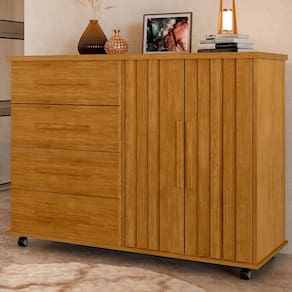 Cômoda Lady 2 Portas e 4 Gavetas é a combinação perfeita entre charme e funcionalidade. Seu design ripado traz um toque de sofisticação e modernidade ao ambiente, enquanto o tom amadeirado Marrom valoriza a beleza natural da madeira. Com amplo espaço interno e gavetas espaçosas, é ideal para organizar roupas, acessórios e diversos itens com praticidade. Um móvel elegante que transforma o quarto em um espaço ainda mais acolhedor e harmonioso. Produto Montado: Sim Acabamento da Gaveta: Pintura UV Acabamento da Porta: Pintura UV Acabamento da Prateleira: Pintura UV Altura dos Pés: 7 cm Altura Máxima dos Pés: 7.0000 Ambiente Principal: Quarto codigo_ean: 7900288276155 Complexidade da Montagem: Alta: deve ser montado por um montador especializado Cor: Marrom Cor do Produto: Marrom Cor Flex: NÃO Cor Interna: Marrom Escala de Brilho: Brilhante Escala de Brilho da Gaveta: Brilhante Escala de Brilho da Porta: Brilhante Escala de Brilho da Prateleira: Brilhante Gaveta com Chave: Não Itens Inclusos: 1 Cômoda e Kit Ferragens Linha ou Coleção: Lady Manual de Montagem e Instalação: https://product-hub-prd.madeiramadeira.com.br/779580848/documents/e83e66d6-dd1a-4b36-9fbe-7c4b97e9d40d329437086717615909949765.pdf Marca: J&A Móveis Material da Gaveta: MDF/MDP Material da Porta: MDF/MDP Material da Prateleira: MDF/MDP Material do Fundo: MDF Material do Puxador da Gaveta: MDF Material do Puxador da Porta: MDF Material dos Pés: Plástico Material Principal: MDF/MDP Montagem Flex: NÃO Necessita Montagem: Sim Origem do Produto: Nacional Pés Reguláveis: Não Peso: 53,1 kg Peso Máximo por Gaveta: 12 kg Peso Máximo por Prateleira: 8 kg Porta Janelada: Não Possui Espelho: Não Possui Nichos: Não Possui Pés: 04 Possui Portas: Sim Possui Prateleiras: Sim Possui Rodízio: Sim Quantidade de Gavetas: 04 Gavetas Quantidade de Prateleiras: 01 Prateleira Recomendações de Uso, Manutenção e Limpeza: LIMPEZA COM PANO SECO Rodízio com Trava: Não Sapatas Niveladoras: Não Sistema de Montagem: PARAFUSOS, BUCHA, PORCA Suporta Até (kg): 30 kg Tipo de Cômoda: Adulto Tipo de Corrediça da Gaveta: Metálica Telescópica Tipo de Dobradiça/Corrediça da Porta: Metálica Tipo de Porta: Bater Tipo de Puxador da Gaveta: Externo Tipo de Puxador da Porta: Externo