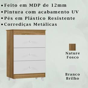 Cômoda Ternura Peternella é o produto ideal para você que quer aliar qualidade, modernidade e aconchego ao quartinho do (a) seu (a) filho (a), excelente para pequenos ambientes. Produzida em MDP bio-sustentável de 12 mm, sua pintura UV é feita diretamente na madeira tratada, proporcionando assim um melhor acabamento ao móvel, conta com 03 gavetas fundas com corrediças metálicas e pés em plástico resistente. Sua altura é de 93 cm, largura de 62 cm e a profundidade 38,3 cm. Este móvel chegará em sua casa separado em 01 volume.