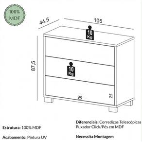Características: Estrutura 100% MDF Acabamento em Pintura UV 03 Gavetas com Corrediças Telescópicas Puxadores em Click Pés em MDF