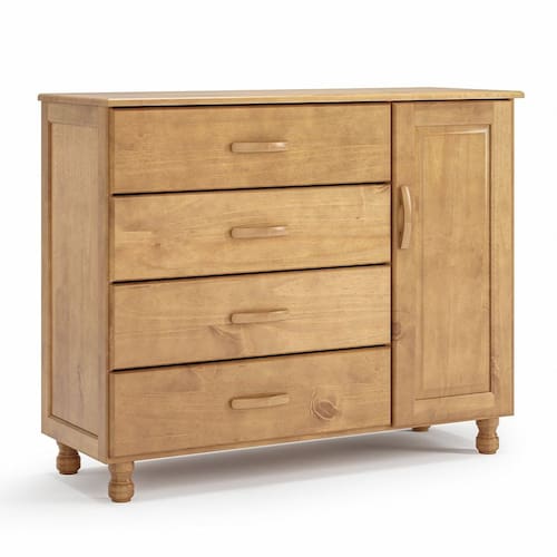 A Cômoda 4 Gavetas 1 Porta 100% Madeira Rústica Ariel é a escolha perfeita para quem busca um móvel robusto, funcional e com presença marcante no ambiente. Produzida com madeira de Pinus de reflorestamento, ela combina resistência e consciência ambiental. Seu acabamento em pintura UV valoriza os veios naturais da madeira, enquanto os pés maciços torneados trazem um toque de charme e sofisticação ao estilo rústico. As quatro gavetas com corrediças metálicas oferecem ótimo espaço para organização, e a porta lateral com dobradiça de pressão garante ainda mais praticidade no uso. Os puxadores em madeira complementam o visual artesanal e acolhedor, tornando essa cômoda uma excelente opção para quem deseja aliar durabilidade e elegância no quarto.