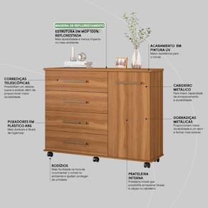 Cômoda com 4 gavetas e 1 porta, com rodízios, material da estrutura em MDP, possui cabideiro, corrediças telescópicas, puxador em ABS, porta de bater, gavetas externas, acompanha manual de montagem, sistema de montagem com cavilhas e parafusos.Vendido e entregue por WebContinental