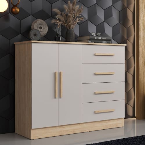 Comoda 4 Gavetas 2 Portas Bariloche Moveis Sul A Comoda Bariloche e a combinacao perfeita de praticidade e estilo para o seu quarto. Produzida em MDP de alta qualidade, conta com 2 portas e 4 gavetas espacosas, garantindo organizacao para roupas, acessorios e objetos pessoais. Seus puxadores em MDF oferecem um toque de sofisticacao, enquanto as corredicas telescopicas proporcionam abertura suave e resistente. Alem disso, possui 1 prateleira interna, ideal para melhor aproveitamento do espaco. Uma peca funcional e elegante que valoriza a decoracao e facilita o dia a dia!