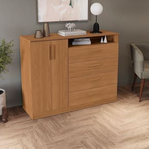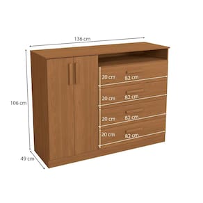 Complete seu quarto com a Cômoda T266 da Kappesberg. Em MDP de 1,2cm, as portas são em 1,5cm, garantindo maior durabilidade. São 1,06m de altura, 1,36m de largura e 47cm de profundidade, podendo inclusive, ser utilizada como trocador. Aumentando o espaço de armazenamento, ela pode ser montada com prateleira ou cabideiro nas portas, que contam com sistema de amortecimento. Já as gavetas, com corrediças telescópicas, permitem a abertura total e garantem maior sustentação. Outro destaque é a prateleira aberta, que permite armazenar itens de uso diário com maior facilidade. Sua pintura na cor canela, em acabamento touch, garante beleza e aconchego ao espaço, combinando com todos os estilos de decoração. E o puxador em MDF revestido na cor canela completa a beleza e diferencial do produto.