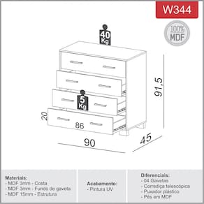 Características: Estrutura 100% MDF Acabamento em Pintura UV 04 Gavetas com Corrediças Telescópicas Pés em MDF Puxadores Plásticos