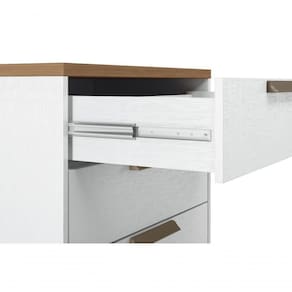 Seu tampo, feito em MDP 25m, aguenta até 15kg e proporciona robustez sem igual ao móvel! O destaque fica para os pés palito em madeira e os puxadores em ABS