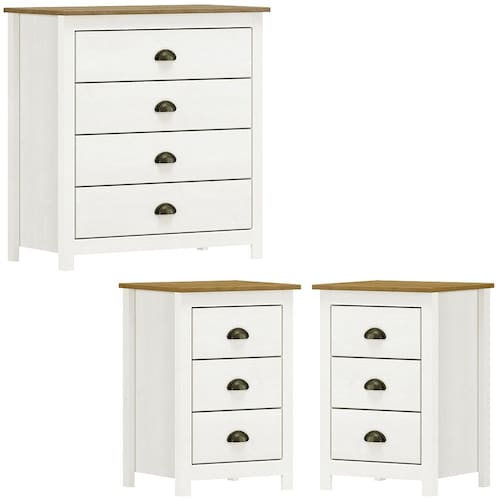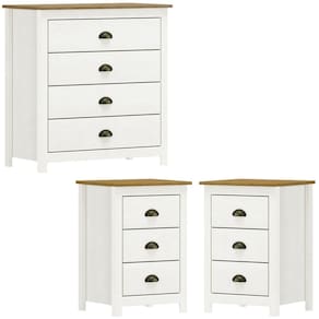 Conjunto Cômoda e 02 Mesas de Cabeceira projetado para quem busca móveis sofisticados e atemporais. Produzido em madeira maciça de pinus de reflorestamento, sua estrutura robusta garante durabilidade e resistência. Seu acabamento com pintura acetinada em verniz PU e UV realça a beleza natural da madeira enquanto protege contra desgastes do dia a dia. A Cômoda possui 04 gavetas, e as Mesas de Cabeceira 03 gavetas, que contam com corrediças telescópicas, permitindo uma abertura suave e silenciosa. Além disso, o design apresenta puxadores metálicos no estilo concha que agregam um charme artesanal, e pés alongados em madeira que trazem leveza e sofisticação ao móvel. Estes móveis chegarão em sua casa separados em 03 volumes.