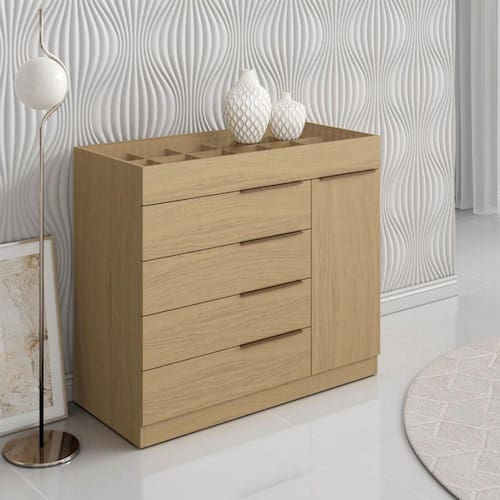 A Cômoda 1 porta e 5 gavetas da Aramóveis é produzida com material de qualidade e contém design funcional e sofisticado. Dispõe de amplo espaço para armazenamento de pertences. Seu tampo em vidro confere elegância à peça e torna visível o porta joias presente na primeira gaveta, proporcionando um toque de sofisticação.