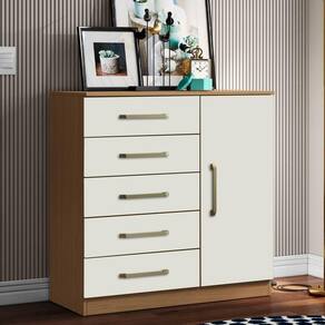 Cômoda Milão, design resistente e versatil para implementar seu quarto. Estrutura em MDP (15/12 mm) com acabamento em Verniz. Possui porta com dobradiças metálicas, gavetas com corrediças telescópicas, puxadores em plástico e prateleira interna. Este produto será entregue em 1 volume.