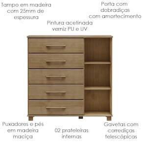 Apresentamos a Cômoda que combina funcionalidade e elegância para o seu ambiente. Produzida com madeira maciça de pinus de reflorestamento, garante qualidade e durabilidade. A pintura acetinada em verniz PU e UV oferece um acabamento suave e resistente, realçando a beleza natural da madeira enquanto protege contra desgastes do dia a dia. Com 125cm de largura, o design funcional conta com 05 gavetas equipadas com corrediças telescópicas, que proporcionam um deslizamento suave e sem esforço, 01 porta com dobradiças com amortecimento, que permitem um fechamente sem impactos, além de 02 prateleiras internas que oferecem mais espaço para armazenamento e organização. O tampo em madeira de 25mm de espessura confere robustez e sofisticação ao design, enquanto os puxadores e pés em madeira maciça garantem um toque natural e refinado, que harmoniza perfeitamente com qualquer decoração. Este móvel chegará em sua casa separado em 02 volumes.