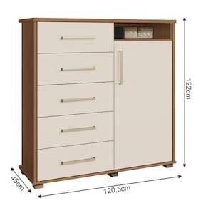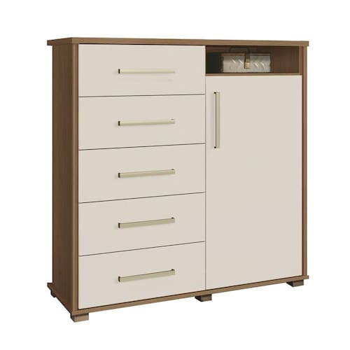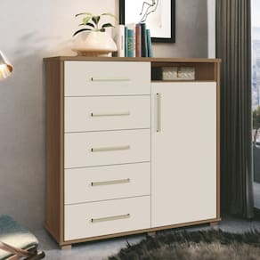 Precisando de um complemento perfeito e espaçoso para arrumar as suas roupas e pertences? Então venha conferir a Cômoda Para Quarto 5 Gavetas 1 Porta 3 Prateleiras Siena F08 Freijó/Off White que a Mpozenato trouxe para você!