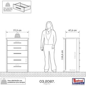 A Cômodas Batrol são ideais para quem tem espaço mais restrito e precisa de um local para guardar e organizar objetos. Na maioria das vezes, as cômodas ainda podem substituir ou complementar móveis maiores, como guarda-roupas ou armários, abrindo espaço físico e visual no ambiente. Produto Montado: Sim Acabamento da Gaveta: Pintura Ambiente Principal: Quarto codigo_ean: 7899451830853 Complexidade da Montagem: Média: pode ser montado por mais de uma pessoa e/ou necessite de maior conhecimento para montagem Cor: Freijó /Off-White Cor do Produto: Freijó /Off-White Cor Flex: Não Cor Interna: Freijó Escala de Brilho: Fosco Escala de Brilho da Gaveta: Fosco Gaveta com Chave: Não Itens Inclusos: 1 Cômoda, Kit Ferragens e Manual de Montagem Linha ou Coleção: Elegance Manual de Montagem e Instalação: https://product-hub-prd.madeiramadeira.com.br/880877/documents/a38fe814-79a9-428c-948c-84d8783e2076reviso01corrediatelescpica.pdf Material da Gaveta: MDP Material do Fundo: HDF Material do Puxador da Gaveta: MDF Material Principal: MDP Montagem Flex: Não Necessita Montagem: Sim Origem do Produto: Nacional Peso: 48,4 kg Peso Máximo por Gaveta: 5 kg Possui Espelho: Não Possui Nichos: Não Possui Pés: Não Possui Portas: Não Possui Prateleiras: Não Quantidade de Gavetas: 05 Gavetas Recomendações de Uso, Manutenção e Limpeza: Pano úmido Sapatas Niveladoras: Não Sistema de Montagem: Parafuso Suporta Até (kg): 25 kg Tipo de Corrediça da Gaveta: Metálica Telescópica Tipo de Puxador da Gaveta: Externo