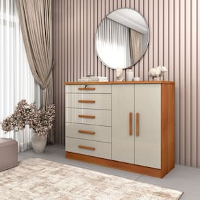 A Cômoda 5 Gavetas Istambul Tcil Móveis é a peça ideal para quem busca elegância e funcionalidade em um único produto. Com cinco gavetas, uma com chave, com corrediças telescópica e duas porta com dobradiças metálicas. O móvel possui um excelente espaço interno para guardar roupas, sapatos e outros objetos. A Cômoda 5 Gavetas Istambul Tcil Móveis é feita em MDP e 7 puxadores em MDF proporcionando beleza e conforto ao cliente. Acabamento da Gaveta: Pintura UV Acabamento da Porta: Pintura UV Acabamento da Prateleira: Pintura UV Ambiente Principal: Quarto Complexidade da Montagem: Média: pode ser montado por mais de uma pessoa e/ou necessite de maior conhecimento para montagem Cor: Cinamomo/Off White Cor do Produto: Cinamomo/Off White Escala de Brilho: Brilhante Escala de Brilho da Gaveta: Fosco Escala de Brilho da Porta: Fosco Escala de Brilho da Prateleira: Fosco Gaveta com Chave: Sim Informações Complementares: Divisória de gaveta biju para jóias Itens Inclusos: 1 Cômoda, Manual de Montagem e Kit Ferragens Linha ou Coleção: Istambul Manual de Montagem e Instalação: https://product-hub-prd.madeiramadeira.com.br/732153/documents/e7e42ba7-f67e-472a-b8d9-5a05db456dcaaldemontagemcOmodaistambul.pdf Material da Gaveta: MDP Material da Porta: MDP Material da Prateleira: MDP Material do Fundo: MDP Material do Puxador da Gaveta: MDF Material do Puxador da Porta: MDF Material Principal: MDF Necessita Montagem: Sim Origem do Produto: Nacional Peso: 60.55 Peso Máximo por Gaveta: 5 Peso Máximo por Prateleira: 5 Possui Espelho: Não Possui Nichos: Não Possui Pés: Não Possui Portas: Sim Possui Prateleiras: Sim Quantidade de Gavetas: 05 Gavetas Quantidade de Prateleiras: 02 Prateleiras Recomendações de Uso, Manutenção e Limpeza: Limpar somente com pano macio e seco, não colocar diretamente em incidência da luz solar. Sapatas Niveladoras: Não Sistema de Montagem: Parafusos, cavilhas e pregos. Suporta Até (kg): 30 Tipo de Corrediça da Gaveta: Metálica Telescópica Tipo de Dobradiça/Corrediça da Porta: Metálica Tipo de Porta: Bater Tipo de Puxador da Gaveta: Externo Tipo de Puxador da Porta: Externo Ean: 7909903390283