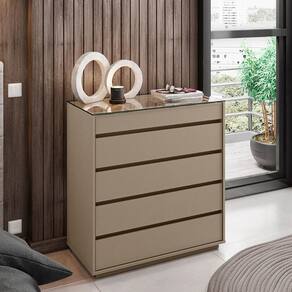 A Comoda 5 Gavetas Belize Casa D combina design moderno e funcionalidade para o seu quarto. Com cinco gavetas, incluindo uma superior com organizador interno para joias e relogios, seu tampo de vidro e estrutura em MDP de alta resistencia garantem durabilidade. Gavetas com corredicas telescopicas, pintura Print Wood exclusiva Casa D e bordas com acabamento Soft PU oferecem qualidade e estilo unicos.