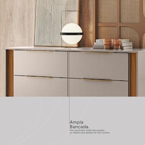 O grande diferencial está na experiência sensorial do acabamento Touch e Prime TX, que proporcionam a sensação natural da madeira ao toque, unindo uma textura agradável à alta resistência necessária para o uso diário. Além disso, sua ampla bancada é perfeita para acomodar objetos decorativos ou itens que precisam estar sempre à mão.