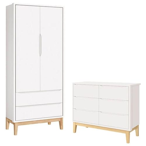 Cômoda 6 Gavetas e Guarda Roupa 2 Portas New Classic Branco com Pés Madeira Natural- Reller