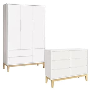 Cômoda 6 Gavetas e Guarda Roupa 3 Portas New Classic Branco com Pés Madeira Natural - Reller