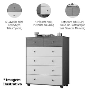Característica da Cômoda Vittória: - Produzida em MDP de alta qualidade; - Acabamento de pintura em UV; - 6 gavetas com corrediças telescópicas; - Trava de sustenção nas gavetas maiores; - Puxadores em Abs; - 4 pés em Abs; - Não acompanha objetos de decoração; - Montagem por conta do comproador;
