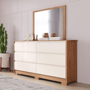FICHA TÉCNICA: Acabamento: Na versão Castanho HP é pintura UV texturizada, na versão Jequitibá Brilho é pintura UV e na versão Nature/Off White é pintura UV texturizada e Pintura UV Cor Interna: Trama Escala de Brilho: Na versão Jequitibá é pintura brilho e na versão Nature/Off White é pintura fosco/brilho Material do Fundo: MDF Possui Ganchos: Não Possui Iluminação Led: Não Possui porta Objetos: Não Qtd. Portas: Não possui Qtd. Gavetas: 6 Und. Material da Gaveta: MDP Material da Corrediça: Telescópica Peso Máximo por Gaveta: 3 KGs Possui Organizador de Gaveta: Não Qtd. Prateleiras: Não possui Possui pés: 6 Und. Material dos Pés: ABS Altura Pés/Rodapés: 5 Cm Pés Regulavés: Não Possui Espelho: Sim Medidas do Espelho: 75 x 70 cm Espessura Espelho: 3mm Possui Vidro: Não Produto Suporte até -Kg-: 26 Kg Material Principal: MDP Medidas Montado: 185 x 129,5 x 48 Cm Peso Montado: 56 Kg Possui Rodízios: Não Tampo Basculante: Não Possui Nichos: Não