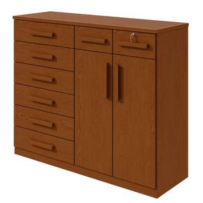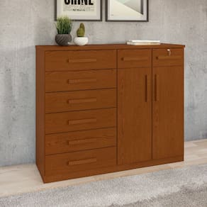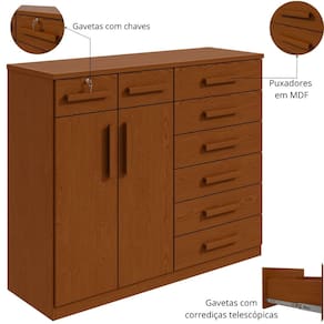 Caracteristicas: Estrutura Principal MDF/MDP Estrutura da porta e gaveta MDP 15mm Estrutura do Fundo HDF 2,5 mm 8 Gavetas com corredica Telescopica 2 Portas 2 Prateleiras Sistema de Montagem Parafusos e Minifix Suporta Ate -kg- 70 kg Peso Maximo por Gaveta 10 kg Peso Maximo por Prateleira 5 kg Acabamento em Pintura UV Escala de Brilho da Porta Brilhante