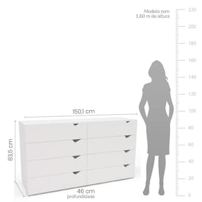 A cômoda 8 gavetas Porto, da Politorno Móveis, combina design moderno, elegante e sofisticado, trazendo um toque de requinte para qualquer ambiente. Fabricada em MDP/MDF, possui acabamento em pintura UV e FF, garantindo maior durabilidade e resistência. Seus puxadores embutidos conferem um visual clean e sofisticado, enquanto as corrediças telescópicas proporcionam um deslizamento suave das gavetas. Com dimensões de 83,5 cm de altura, 150 cm de largura e 46 cm de profundidade, oferece amplo espaço para organização, sendo ideal para quartos e closets. De alta qualidade, essa cômoda alia funcionalidade e estilo para um ambiente bem estruturado. Produto Montado: Sim Acabamento da Gaveta: Pintura UV Acabamento dos Pés: Poliéster Altura dos Pés: 0,37 cm Altura Máxima dos Pés: 0.3700 Ambiente Principal: Quarto codigo_ean: 7900288108029 Complexidade da Montagem: Média: pode ser montado por mais de uma pessoa e/ou necessite de maior conhecimento para montagem Cor: Branco Cor do Produto: Branco Cor Interna: Branco Escala de Brilho: Semi-Fosco Escala de Brilho da Gaveta: Semi-Fosco Gaveta com Chave: Não Itens Inclusos: 1 Cômoda, Kit Ferragens e Manual de Montagem Linha ou Coleção: Porto Manual de Montagem e Instalação: https://product-hub-prd.madeiramadeira.com.br/983921/documents/0314952c-91f7-4d55-99c4-743728739b332781114622417436216591693.pdf Marca: Politorno Material da Gaveta: MDF/MDP Material do Fundo: MDF/MDP Material dos Pés: Plástico Material Principal: MDF/MDP Necessita Montagem: Sim Origem do Produto: Nacional Pés Reguláveis: Não Peso: 33,96 kg Peso Máximo por Gaveta: 5 kg Possui Espelho: Não Possui Nichos: Não Possui Pés: 06 Possui Portas: Não Possui Prateleiras: Não Possui Rodízio: Não Quantidade de Gavetas: 08 Gavetas Recomendações de Uso, Manutenção e Limpeza: Utilize um pano macio umedecido com água e sabão neutro, seguido de pano seco. Não utilize produtos químicos ou abrasivos para limpeza, pois estes danificam o revestimento do móvel. Sapatas Niveladoras: Sim Sistema de Montagem: Cavilha, Parafuso, Minifix e prego Suporta Até (kg): 60 kg Tipo de Cômoda: Adulto Tipo de Corrediça da Gaveta: Metálica Telescópica Tipo de Puxador da Gaveta: Embutido undefined: 983929